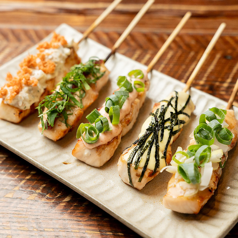 丁寧に火入れした柔らかいとりムネ肉に、各種具材やソースをのっけた串です!様々な味付けやトッピングがございますので是非ご賞味ください!ビールはもちろん、日本酒やワインとの相性も◎
