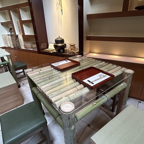 竹を基調とした空間、落ち着きのある店内です。カウンター席、テーブル席、テラス席とシーンに合わせてお食事をお楽しみください♪細部までこだわり抜いた非日常空間で至福のひと時を。