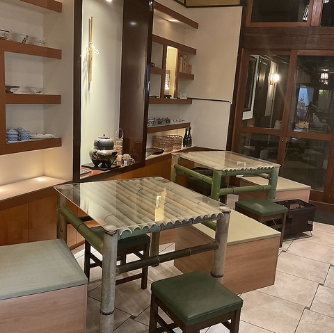 竹を基調とした空間、落ち着きのある店内です。カウンター席、テーブル席、テラス席とシーンに合わせてお食事をお楽しみください♪細部までこだわり抜いた非日常空間で至福のひと時を。