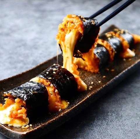 当店オリジナルのチーズキンパ!肉の旨みが詰まったこだわりのご飯とまろやかなチーズと相性抜群です!コギソウルでしか味わえない絶対に外せない逸品です!(河原町/京都/居酒屋/韓国料理/食べ放題/飲み放題/食べ飲み放題/貸切/チュクミ/チーズ/サムギョプサル/スンドゥブ)