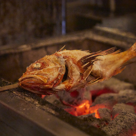 朝どれの鮮魚を豪快に炉端、藁焼きに。食材の旨みを高温で焼き上げさらに旨みを凝縮させています。どのお席からも見えるライブ感はクセになること間違いなし。オーダー必須の一品になっています。旨みを閉じ込め、香ばしい香りと食感が引き立ちます。忘年会にもおすすめのコースをご用意しております。