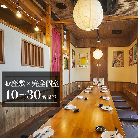 【10名・20名・30名・最大38名収容の掘りごたつ×個室】周りを気にせず安心して楽しめる個室は、4名・8名・10名・16名・20名・最大38名まで収容可能!人数にぴったりの個室をご案内しますので、少人数の飲み会から会社宴会まで幅広く楽しくご利用いただけます。会話が弾む落ち着いた空間で、接待や会食、歓送迎会にも最適!