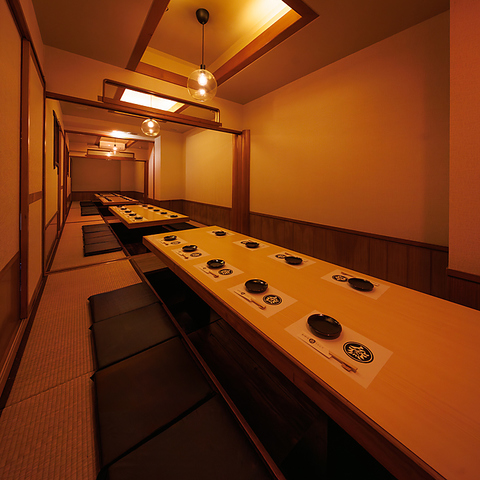 大人数の宴会にも対応可能な掘りごたつ半個室!仕切りを外して横並びでゆったり座れるので、歓送迎会や打ち上げ、会社の宴会に最適!どこに座っても顔が見渡せる配置で盛り上がりやすさも抜群です!