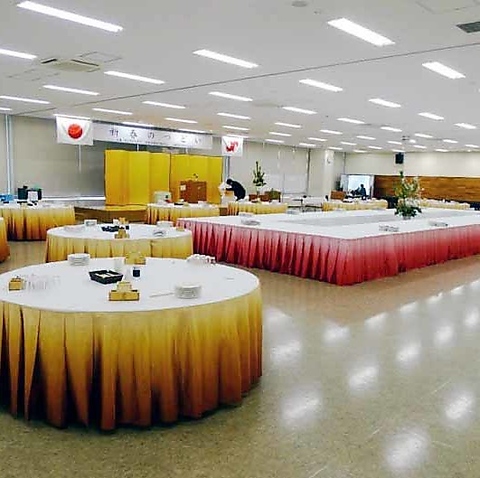 【大型宴会場】白い壁と暖色系の照明で、落ち着いた雰囲気を演出する大型空間。最大500名様まで着席・立食形式でご利用可能で、170inchの大型スクリーンも完備しています。大規模なご宴会やパーティーにご利用ください!※6か月前からご予約承っております。詳細は店舗までお問い合わせください。