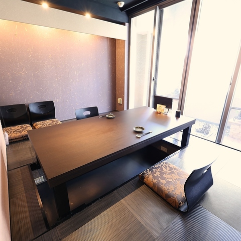 【大個室:最大10名様まで】4名様用、6名様用の半個室は、つなげて最大10名様までご利用いただける完全個室として、様々なシーンに対応可能です。掘りごたつのお座敷で、足を伸ばしてゆったりと。高級感あふれる落ち着いた雰囲気の中で、心安らぐひとときをお過ごしください。
