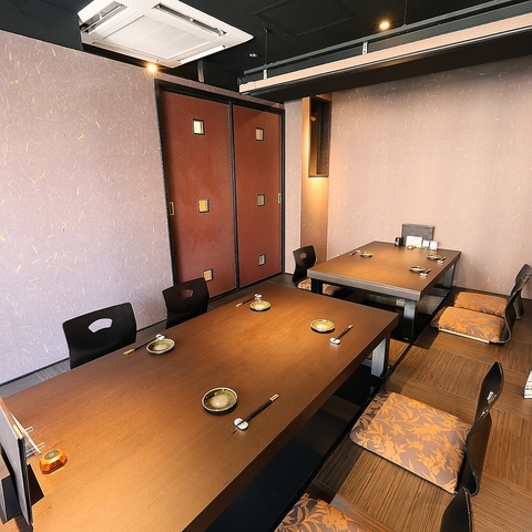 【大個室:最大10名様まで】4名様用、6名様用の半個室は、つなげて最大10名様までご利用いただける完全個室として、様々なシーンに対応可能です。掘りごたつのお座敷で、足を伸ばしてゆったりと。高級感あふれる落ち着いた雰囲気の中で、心安らぐひとときをお過ごしください。