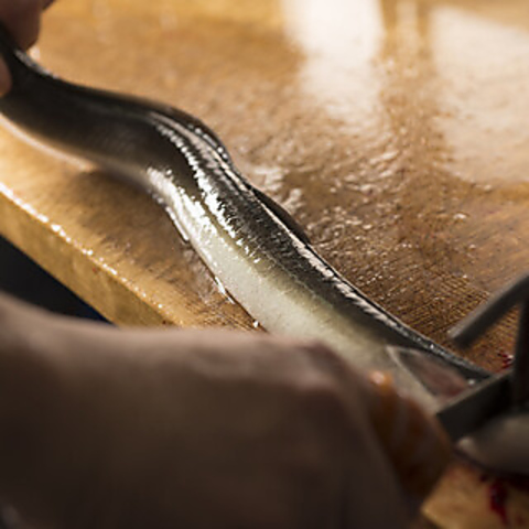 活鰻を店内でさばく当店では鰻の皮、骨、あらゆる内臓の部位をさまざまな調理法で。旬食材で伝統的な味。
