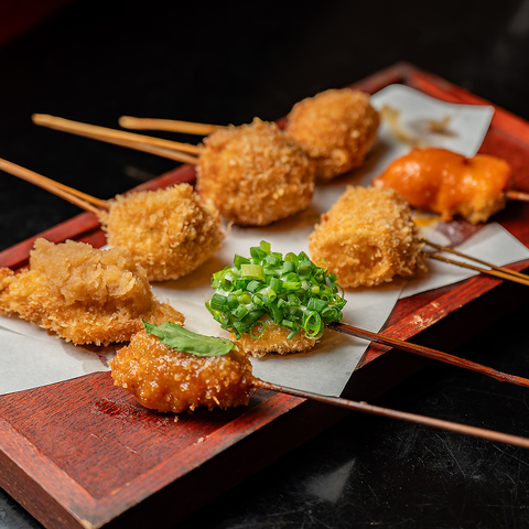 ナス・チーズ・ベーコンの合わせや帆立貝のカレー風味など、お客様の楽しいひとときを彩る串揚げをご用意!