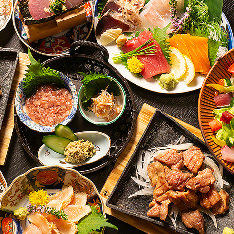 旬の刺身や藁焼き、九州産鳥タタキに大山鶏・牛タンの炭火焼き、名物「ウニとイクラの手巻き寿司」まで贅を尽くした逸品揃いのコース。〆は地鶏出汁の冷やし蕎麦で。全国の地酒や果実サワーなど豊富な飲み放題と共に、特別なひとときをお楽しみください。(〆を地鶏出汁鍋に変更できます!)