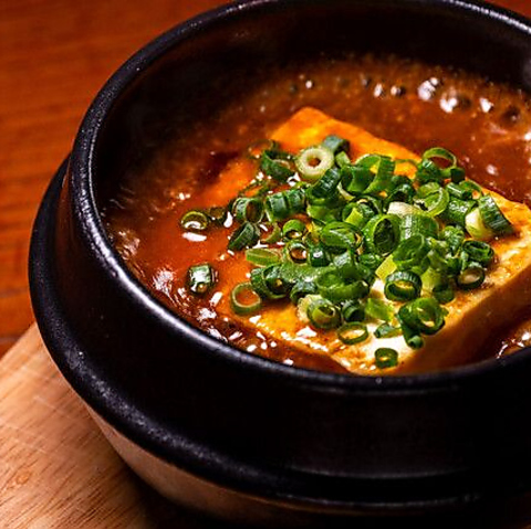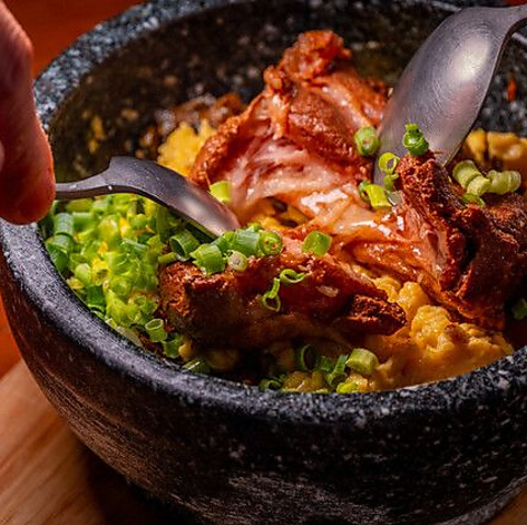 熱々の石鍋で仕上げる人気の〆ごはん。とろけるラフテーの旨み、高菜の塩気、麻辣の刺激が絶妙に絡み合い、香ばしいおこげまで美味しい一皿。席で仕上げるライブ感も楽しい、満足度の高い石焼飯です!