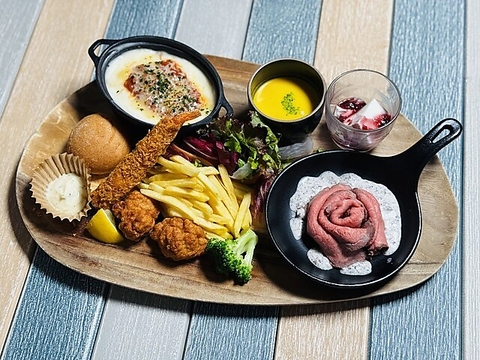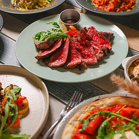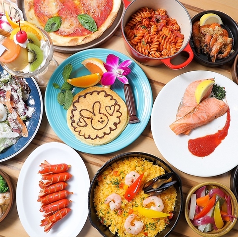 飲み放題が付いたDINNER限定大皿シェアプランをご用意しております。サラダにパスタ、お肉料理に人気のパンケーキも。見た目にも美しいお料理がテーブルに並びます。歓送迎会、誕生日会のお祝いなど特別な日もぜひ当店にお任せください。