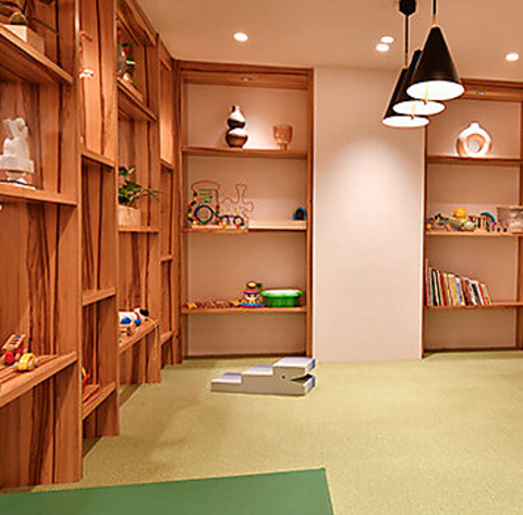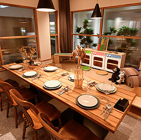 店内中央には、世界15か国から厳選した約100社のあそび道具を販売する「ボーネルンド」監修のキッズスペースを完備。あそびながら学べる知育玩具が自由にお楽しみいただけます♪店内全席ベビーチェアの使用も可能で2部屋ある完全個室のうち1部屋はキッズスペースも完備しております。ママ会やご家族のお集まりなど様々なシーンに◎