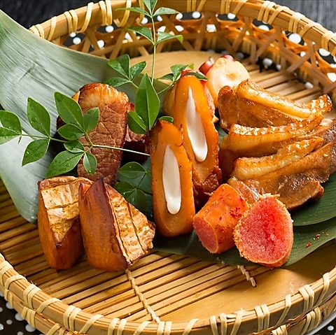 熊本の郷土料理を東京・銀座で再現しました。地元の方も納得のラインナップを存分にご堪能いただけます!幻と称される熊本の地鶏『天草大王』のモモ肉や有明の地蛸、鹿児島の黒豚『六白黒豚』のロースハムなど、厳選食材を自家製の燻製に仕上げた逸品です。