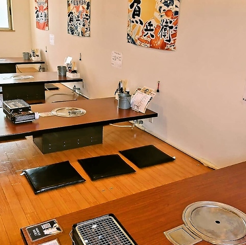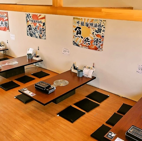 温かい木目調の座卓が広々とした空間にゆとりを持って配置され、各席にはお客様自身で新鮮な魚介を焼くことができる本格的な浜焼きグリルを完備しています☆壁面には力強く活気あふれる大漁旗が飾られ、店内全体に和の温もりと親しみやすい賑やかさが共存。お客様が足を伸ばしてゆったりとくつろげる座布団も用意されております◎