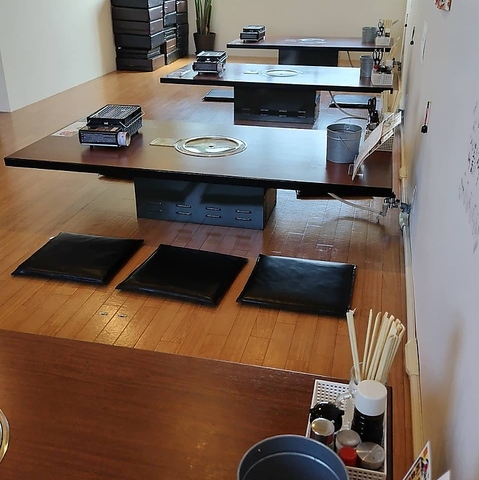 温かい木目調の座卓が広々とした空間にゆとりを持って配置され、各席にはお客様自身で新鮮な魚介を焼くことができる本格的な浜焼きグリルを完備しています☆壁面には力強く活気あふれる大漁旗が飾られ、店内全体に和の温もりと親しみやすい賑やかさが共存。お客様が足を伸ばしてゆったりとくつろげる座布団も用意されております◎