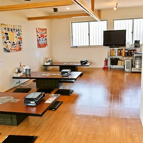 温かい木目調の座卓が広々とした空間にゆとりを持って配置され、各席にはお客様自身で新鮮な魚介を焼くことができる本格的な浜焼きグリルを完備しています☆壁面には力強く活気あふれる大漁旗が飾られ、店内全体に和の温もりと親しみやすい賑やかさが共存。お客様が足を伸ばしてゆったりとくつろげる座布団も用意されております◎