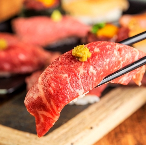 国産牛の霜降りがのったカルビや赤身の肉寿司ございます!食べ放題でお楽しみください!