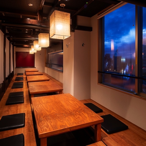 窓際で夜景も楽しめる掘りごたつ席。