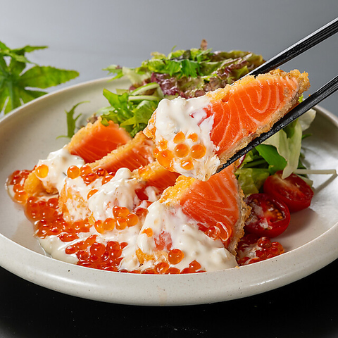 種類豊富なメニューはどれを頼んでも間違いなし!おすすめはサーモンのレアカツ!外はサクサク揚げたての衣に包まれた、レアなサーモンの絶妙なとろけ具合はまさに絶品!特製タルタルソースとの相性も抜群です!