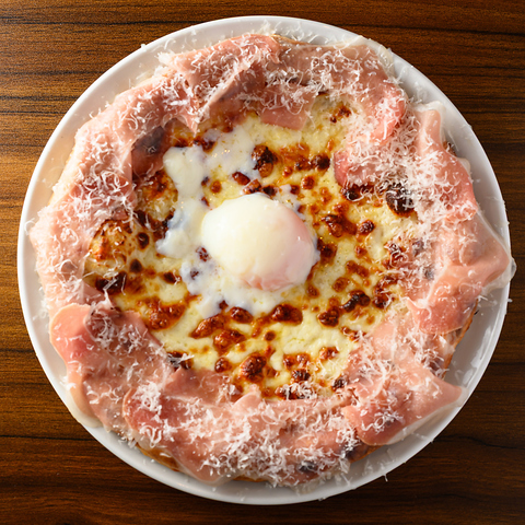 名物のピッツァは小麦の香り引き立つ全粒粉使用。加水率を高め、時間をかけ発酵させた生地はもちっと軽い食感です。トマトソースベースにブッラータチーズを乗せた"イタリア"や半熟卵とピザ生地の相性が抜群のビスマルクなど6種類をご用意。
