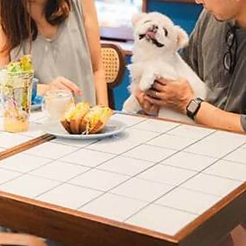 カフェタイムは明るくPOPな空間で女子会やママ会におすすめ☆大型犬のワンちゃんもOKなテラス席から、人数によってレイアウトも変更可能なテーブル席まで◎テラス席は10席、店内は40席ご用意しております。一部店内ではワンちゃんと一緒にお食事が楽しめます。大切なワンちゃんと一緒にゆったりとお寛ぎください♪