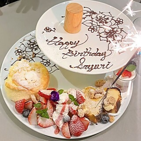 お誕生日・記念日・お祝いにぴったりのスペシャルスイーツセット人気のバスクチーズケーキや季節のスイーツを盛り合わせた、見た目も華やかなデザートプレートSetをご用意しています花火付きで登場する瞬間は、サプライズ感MAX!嬉しい紅茶又はコーヒー付き♪