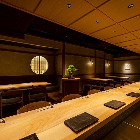【大人の隠れ家◇カウンター席12席】いちょうの木の一枚板カウンター12席と生簀を備えた特別な空間で、鮨と和食が織りなす贅沢なひとときをご堪能ください。4名様まで可能のテーブル席もございます。落ち着いた灯りと木の温もりに包まれながら、会食や接待・大切な方との記念日などに是非、当店をご利用くださいませ。