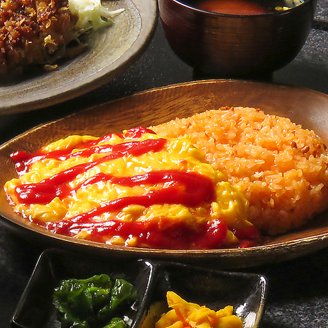 看板メニューのオムライス。チキンライスとガーリックライスからお選びいただけます。Bar Kizuna絆 の定番&大人気メニューです。ランチ、ディナーどちらでもお楽しみいただけます!※ランチ価格 1,100円