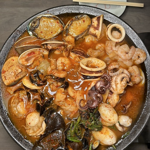 ホルモン・エビ・春雨・エリンギ・手長ダコ・トック・旬野菜・玉ねぎor白ネギ【釜山発祥の人気名物料理】海鮮とホルモンのコクと辛さ、旨味が絶妙に絡み合いお米が進みます! ※辛さは三段階で選べます!(小辛/中辛/激辛) ※追加トッピング可能がです!
