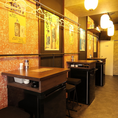 壁際に並んだテーブル席は、立ち飲みの気軽さはそのままに、落ち着いて腰を据えて過ごせるのが魅力。仕事帰りに一人でふらっと立ち寄るのはもちろん、同僚や友人と語らいながら楽しむのにも最適です。温かな照明がほどよい距離感を演出し、立ち飲みならではの賑わいと、ちょっとしたプライベート感の両方を味わえます。