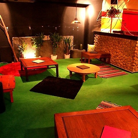 店内にはユニークな芝生が敷かれた空間が広がり、足を伸ばしてゆったりとお過ごしいただけます◎
