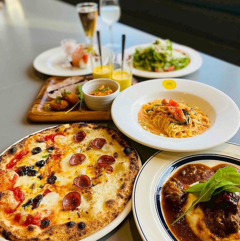 自慢の焼きたてピッツァを中心に、前菜・揚げ物・パスタ・デザートまですべてが食べ放題!自分好みにカスタムできるピッツァも人気。家族や友人と気軽に楽しめる、開放感あふれるお食事を!