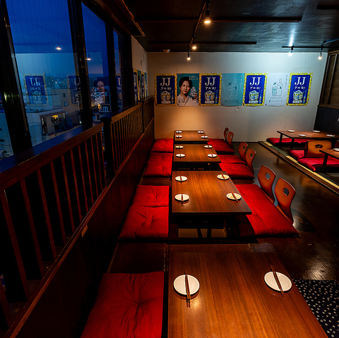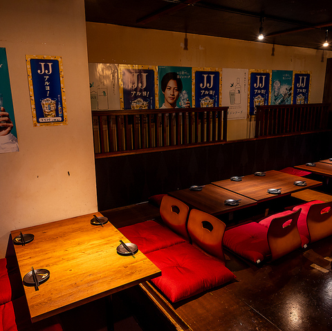 一面見渡せる団体席のため、参加者皆様のお顔を一望できます。挨拶やスピーチなども可能で、席の配置もご希望がございましたらお申し付けください!幹事様必見、幹事様無料クーポンもご用意しております。詳細はクーポンページをご確認ください!お履き物を脱いで足をおろしゆったりと座れる掘りごたつタイプ。