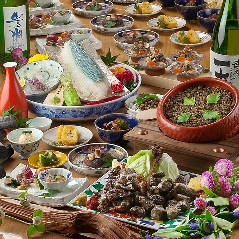 当店のコース料理は全て飲み放題付きで5,000円(税込)よりご準備。"名物の骨付きひね鶏のもも焼き"はもちろん、イカの活き造りやカワハギ活き造り、黒鶏の炊き立て土鍋や濃厚鶏すきなど各種ご用意しております!この機会にぜひご賞味ください。