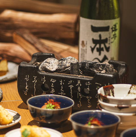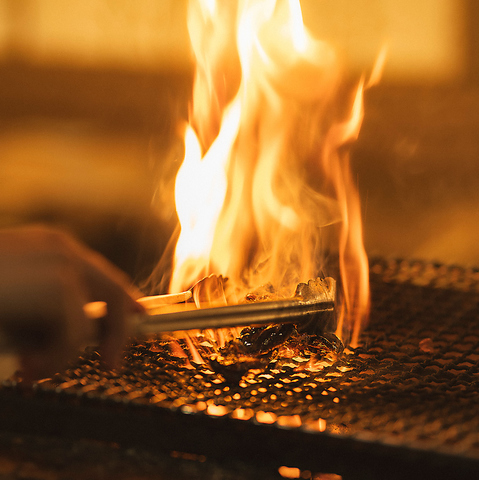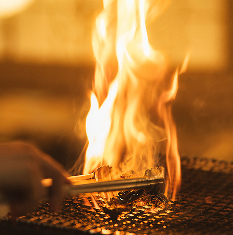【炭火焼き/薪焼き】当店では料理ごとに炭火と薪を使い分け。「筑前備長炭」は安定した火力と遠赤外線効果で、素材を外は香ばしく中はふっくらに。対して広島産のナラ薪は高火力で火柱が立ち、パチパチと音を立てながら旨みを閉じ込め、力強い香りをまとわせます。炭と薪、それぞれの特性が織りなす奥行きのある味わい。