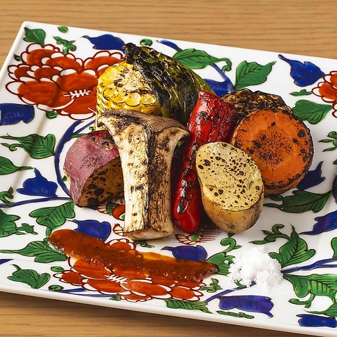 九州各地から届く旬の朝獲れ野菜を、ナラ薪の高火力で豪快に焼き上げました。火柱が立つ薪火で包み込むことで、外は香ばしく、中は素材本来の甘みと瑞々しさをしっかり閉じ込めます。藁焼きを思わせる芳ばしい香りが加わり、野菜だけとは思えない奥深い味わいに。季節ごとの彩りと、薪焼きならではの旨みをぜひお楽しみください。