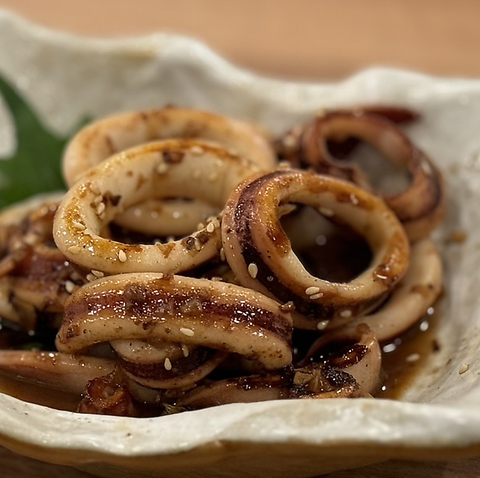 イカを鉄板でガーリックソテーにして博多ポン酢で和えた逸品で