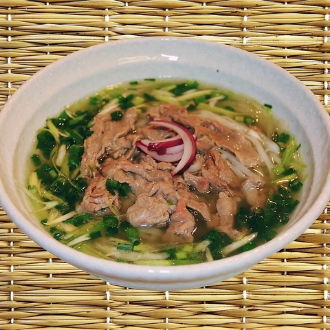 フォーは、8時間じっくり煮込んだ自家製スープを使用しています。透明感のあるスープは、旨味が凝縮されており、一口ごとに豊かな風味を感じられます。牛肉フォーは柔らかい牛肉に新鮮な香草や野菜が彩りを添えています。また、卓上には自家製のベトナム風ラー油とニンニクの酢漬けがあり、お好みで味の変化を楽しめます。