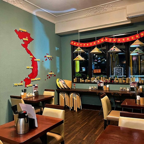 落ち着いた雰囲気の中でベトナム料理を楽しむことができる空間です。木の温もりを感じるシンプルなインテリアは、リラックスした食事を提供します。テーブルは広めに配置されており、ゆったりとした時間を過ごせます。柔らかな照明が心地よい空間を演出し、壁に飾られたアートや装飾がベトナムの風情を感じさせます。