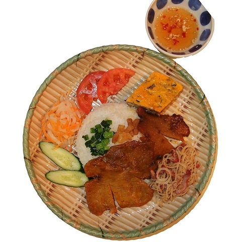 ライスのお代わり180円(税込) トッピングがたっぷり。 砕いた米に、焼き豚肉、目玉焼き、きゅうりやなますなどをのせ、ヌクマム(魚醤)をかけて混ぜながら食べます。※写真は一例です。