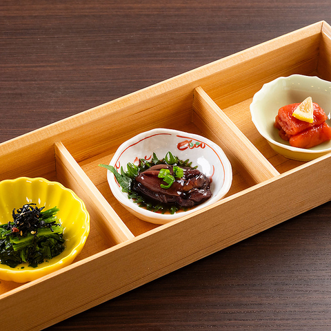 旨み凝縮、日光みそのたまり漬け三種盛り。厳選食材をじっくり漬け込んだ、奥深い味わいの共演。熟成の妙が光る逸品。食前にも、お酒のお供にも。
