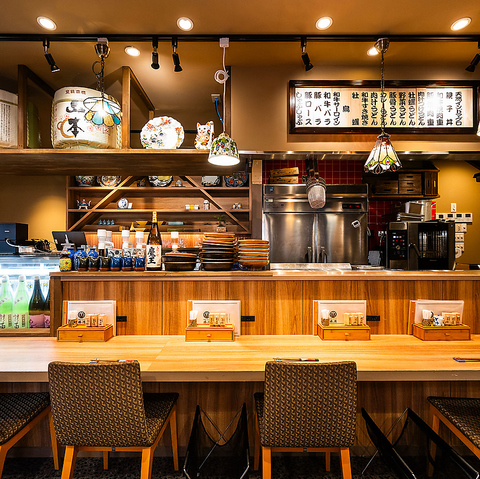 温かみのある照明と木目を基調とした店内は、ゆったりとくつろげる居心地の良い空間。テーブル席は少人数の飲み会やお食事、女子会にもぴったりです。落ち着いた雰囲気の中で、気の合う仲間とゆっくりお食事やお酒をお楽しみいただけます。