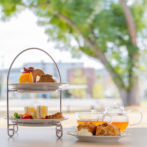 公園の緑に包まれ、旬のスイーツと紅茶を楽しむ上質なひととき。スコーン、セイボリー、プティフールをゆったりと。