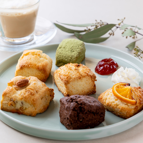 生クリームを使ったしっとり・ふんわりしたスコーンプレーン/ オレンジ/ キャラメルナッツ/ホワイトチョコココナッツ/ 抹茶/ ココアチョコチップの中からお選びください