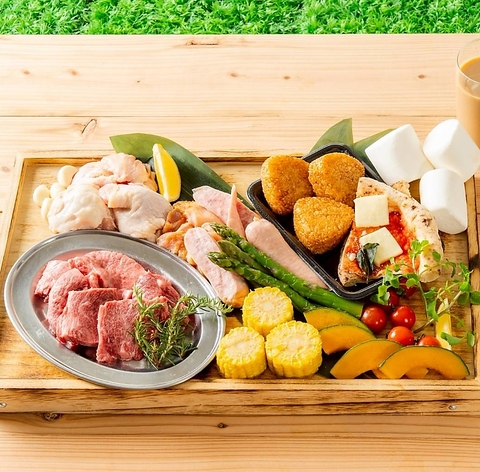 ※テーブルサイト利用料込み/厚切り牛ロース40g/若鶏柔らかモモ肉60g/ウインナー1本/彩り野菜2種盛り(とうもろこし、かぼちゃ)各1個/ピザマルゲリータ1/4カット/焼きおにぎり1個/マシュマロ1個/[ソフトドリンク飲み放題付き:3000円(税込)]/小学生以下対象