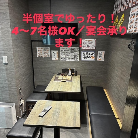 カウンター席でサクッと一人飲みも、半個室で気の合う仲間とゆっくり語る夜もおすすめ。