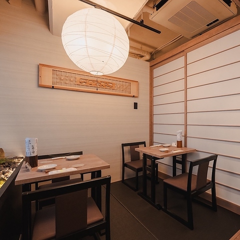 和風モダンな2名様用テーブル席。しっとり落ち着いた雰囲気で、ゆっくりとお食事をお楽しみいただけます。飲み会や女子会、デートやご友人とのお待ち合わせにもお気軽にどうぞ。
