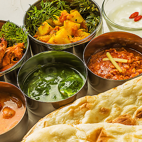 ダル(豆)、ほうれん草、チキン、マトン(羊)、ポーク、シーフードなど種類豊富な本格カレー。辛さは調整できますので、激辛好きな方から辛さが苦手な方まで、美味しくお召し上がりいただけます。ランチではさらにお得なセットでご提供!ぜひ一度お試しください♪