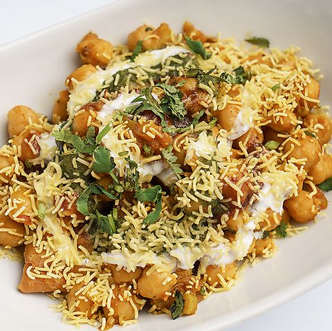 サモサチャット:サモサをつぶしタマリンドソース、ミントとパクチ特製ソース、チャトマサラ、ヨーグルトなど加えて作られた絶品/アルティッカチャット:ジャガイモのパティにヨーグルトと酸味のあるソースをかけたスナック/アルチャット:ジャガイモ、細く切った野菜などにヨーグルトと酸味のあるソースをかけたスナック