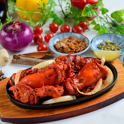 スパイスとヨーグルトに漬け込んだ骨付きチキンの炭焼き